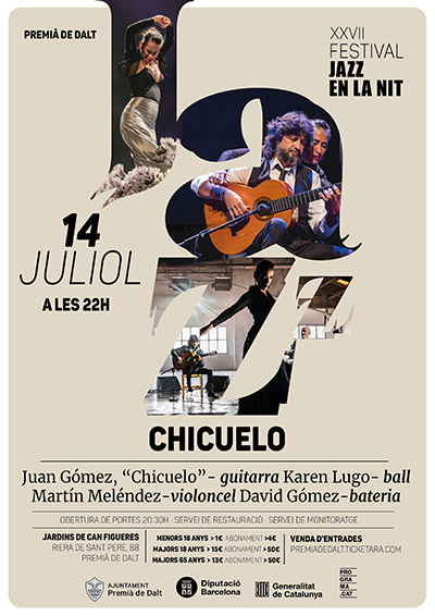El divendres 14 de juliol, comptarem amb la presentació del nou treball discogràfic de Juan Gómez “Chicuelo”, Caminos que amb una formació insòlita, violoncel, bateria i ball, obre nous camins sonors en el flamenc. El guitarrista ja ens ha visitat en altres ocasions on va presentar el seu segon treball discogràfic en solitari, Diapasión (2008) o compartint cartell amb Marinah (2015) i Marco Mezquida (2017 i 2021).