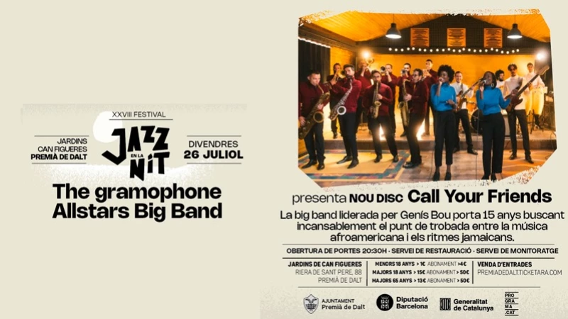 Per acabar, el divendres 26 de juliol, rebrem la visita de The Gramophone Allstars Big Band, que torna a Jazz en la Nit per presentar el seu nou disc, "Call Your Friends". Sota la direcció de Genís Bou, aquesta formació ja ens va impressionar el 2015 amb "Jazzmaica" i el 2018 amb "Maraca Soul".